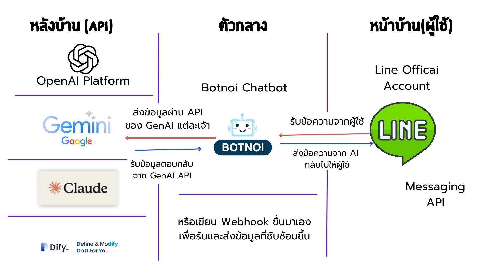 guides on integrating GenAI platforms like ChatGPT with Line OA using Botnoi as an intermediary, detailing API key setup and cautionary advice.